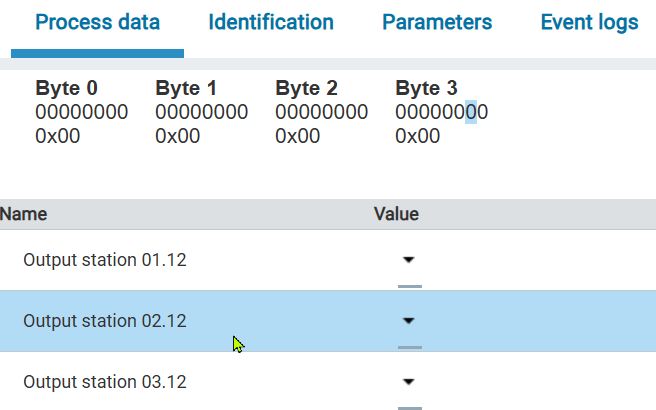 In the process data overview, all current input process data of all ports of the IO-Link network module are displayed. The detailed view is updated every 0.5 second. You can select the formats hexadecimal, decimal or binary for the display of the process data.