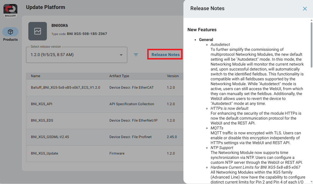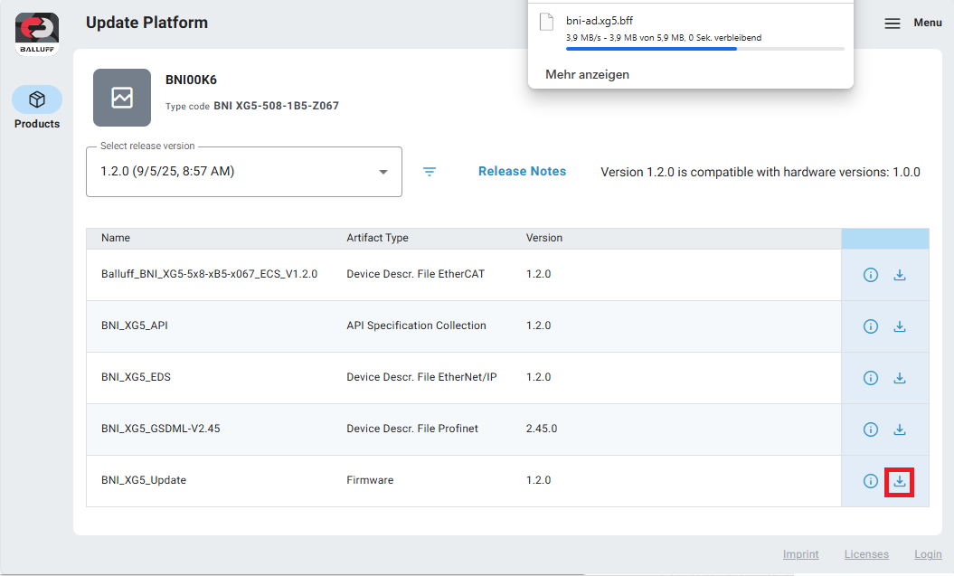 Access the Balluff Update Platform. To do so, open your web browser and navigate to https://update.balluff.systems. You will be redirected to the Products menu.