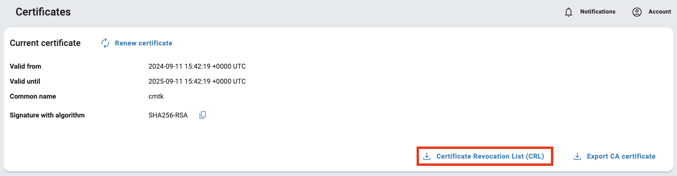 Export the Certificate Revocation List by clicking on the Certificate Revocation List (CRL) button.