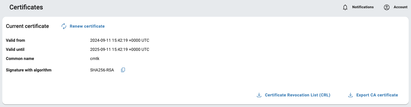 Export the CA certificate by clicking on the Export CA certificate button and select a certificate format depending on the operating system (Windows -> .crt). The Certificate Revocation List is required for OPC UA.