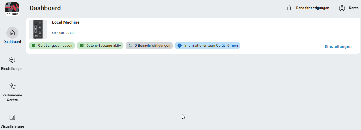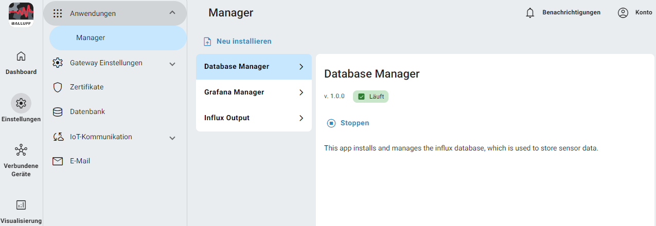 Um zusätzliche von Balluff bereitgestellte Anwendungen zu installieren, navigieren Sie zu Einstellungen -> Anwendunge -> Manager auf der linken Seite des Dashboards. Im App Store werden alle optionalen und einige Hauptanwendungen aufgelistet, die möglicherweise deaktiviert sind.