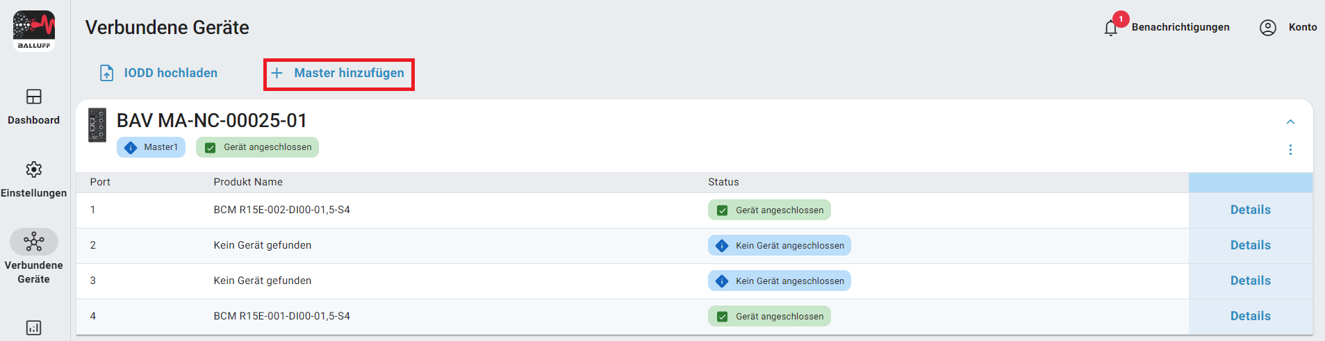 Navigieren Sie zum Menü Verbundene Geräte und klicken Sie auf Master hinzufügen.
