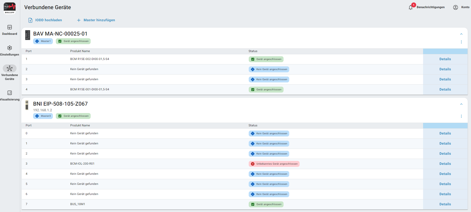 Sie können alle weiteren Einstellungen wie gewohnt für die an den IO-Link-Master angeschlossenen Sensoren vornehmen. Wenn Sie den Master wieder entfernen wollen, finden Sie diese Einstellung unter den 3 Punkten des Masters.