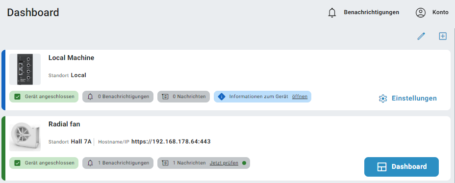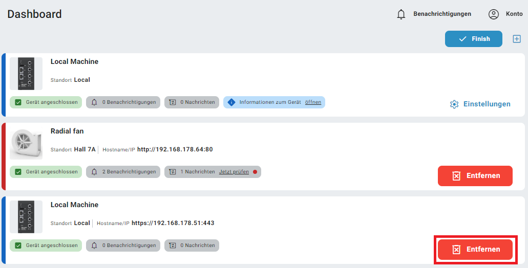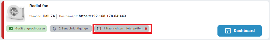 Es gibt verschiedene Zustände eines CMTKs. Sie können den aktuellen Status anhand der Farbe der linken Linie auf der Gerätekachel und des Punktes neben der Schaltfläche "Jetzt prüfen" erkennen: