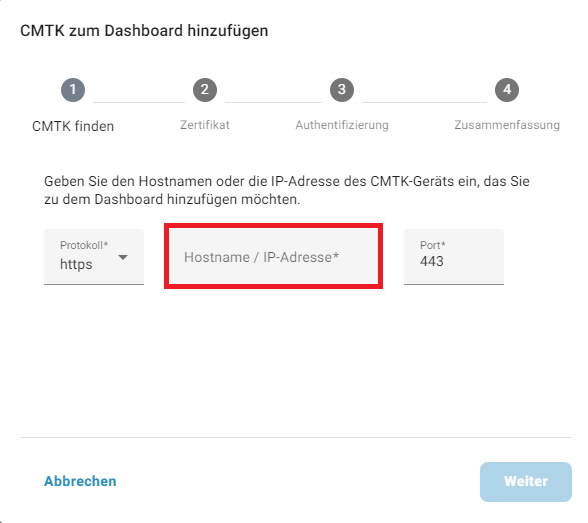 2. Geben Sie den Hostnamen oder die IP-Adresse des CMTK ein und klicken Sie auf "Weiter". Hier können Sie auch das Protokoll und den Port ändern. Es wird jedoch empfohlen, die sichere https-Verbindung zu verwenden.