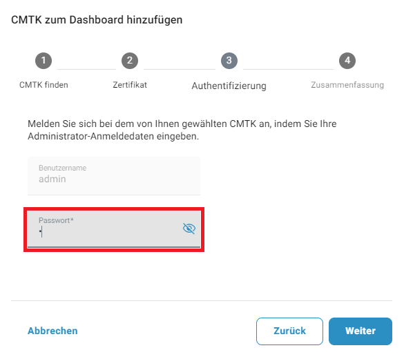 4. Loggen Sie sich mit Ihren Admin-Zugangsdaten in das ausgewählte CMTK ein und klicken Sie auf "Weiter".