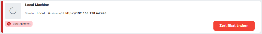 • Fehler Zertifikat (rot): Dieser Status tritt auf, wenn ein Fehler bei der Zertifikatsvalidierung auftritt, was passieren kann, wenn das Zertifikat des verbundenen CMTKs abläuft oder manuell auf dem CMTK neu erstellt wird. Sie können das Zertifikat über die Schaltfläche "Zertifikat ändern" ändern.