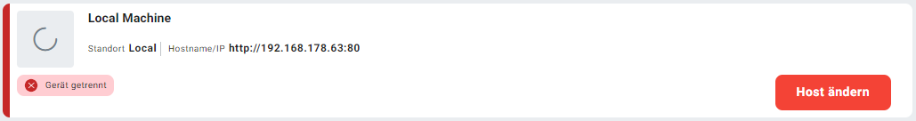 • Fehler Host nicht gefunden (rot): Dieser Status tritt auf, wenn die Verbindung verloren geht, weil das verbundene CMTK nicht erreichbar ist. Wenn das Problem aufgrund eines geänderten Hostnamens auftritt, kann dieser einfach über die Schaltfläche "Host ändern" angepasst werden.
