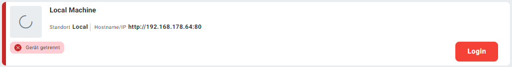 • Fehler Login (rot): Dieser Zustand tritt auf, wenn die Verbindung über die allgemeinen Einstellungen des verbundenen CMTKs getrennt wird. Die Verbindung kann über die Login-Schaltfläche einfach wiederhergestellt werden.