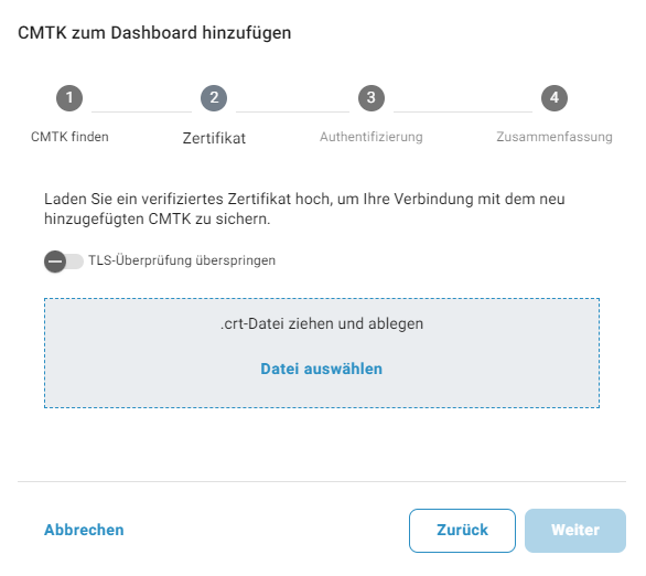 3. Wenn Sie sich für eine sichere https-Verbindung entschieden haben, können Sie hier das Zertifikat hochladen oder die Validierung überspringen. Wenn Sie sich für eine http-Verbindung entschieden haben, können Sie direkt zu Punkt 4 übergehen.