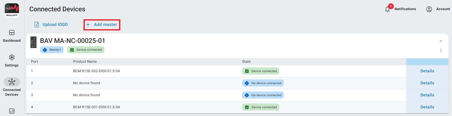 You can make all other settings as usual for the sensors connected to the IO-Link master. If you want to remove the master again, you will find this setting under the 3 points of the master.