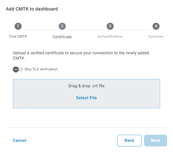 Enter the hostname or ip address of the CMTK and click on "Next". Here you can also change the protocol and the port. However, it is recommended to use the secure https connection.