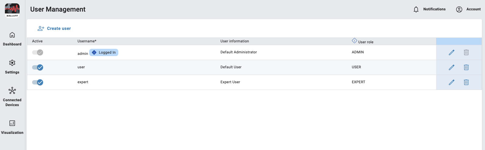 Three different user roles with corresponding user rights are provided for the rights of the users. The rights of the roles are summarized in the following table.