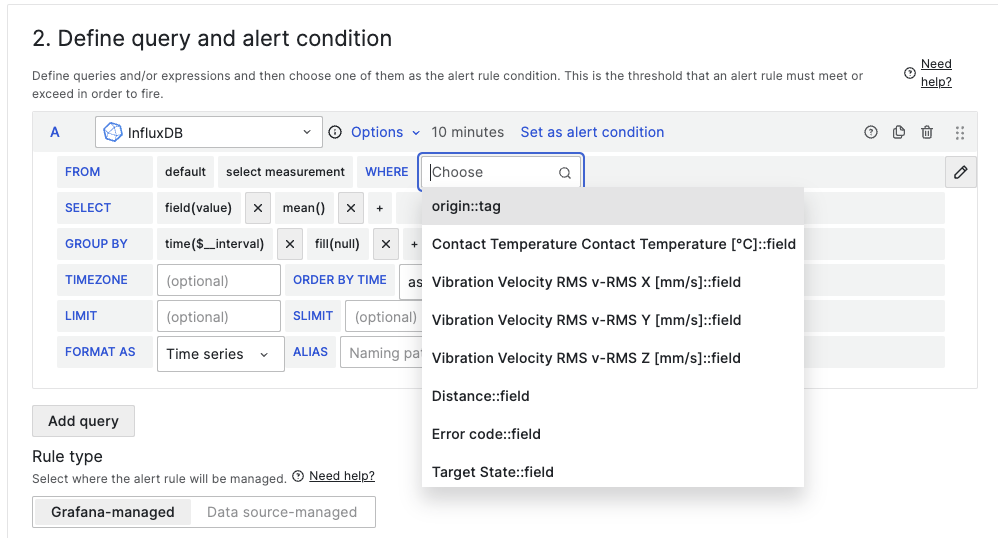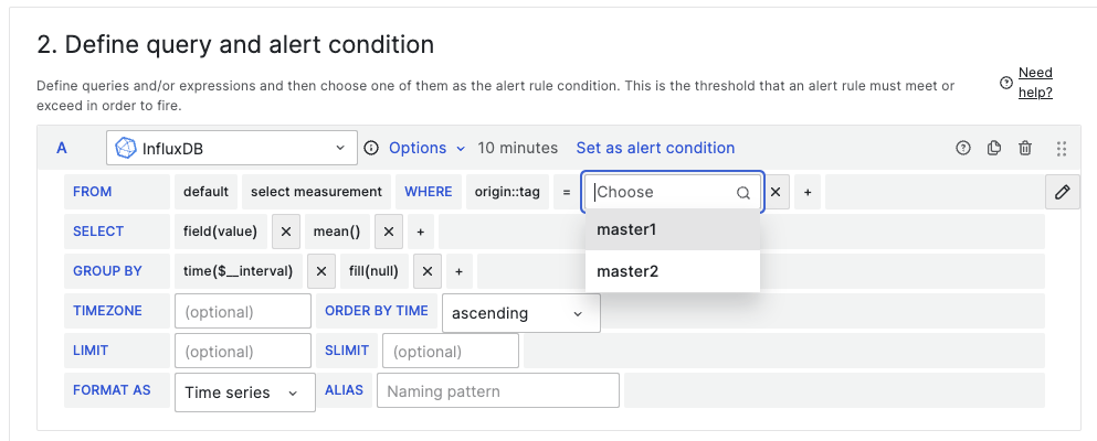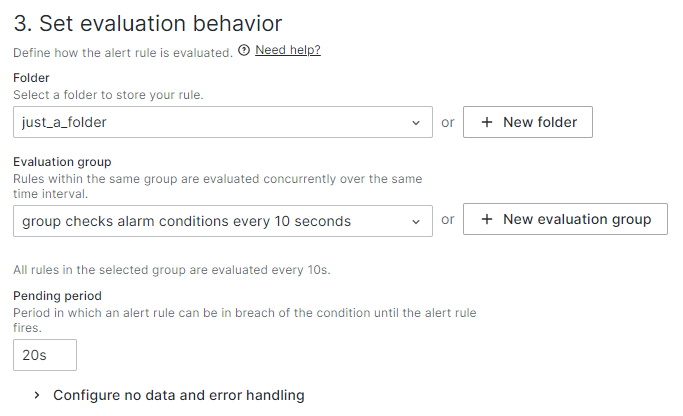 • Add or select any evaulation group you want, this group decides how often the alert will be checked, e.g. every 10 seconds it checks the query interval for the condition