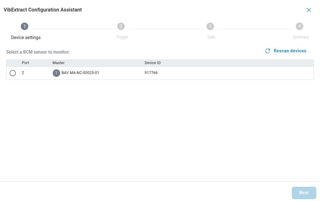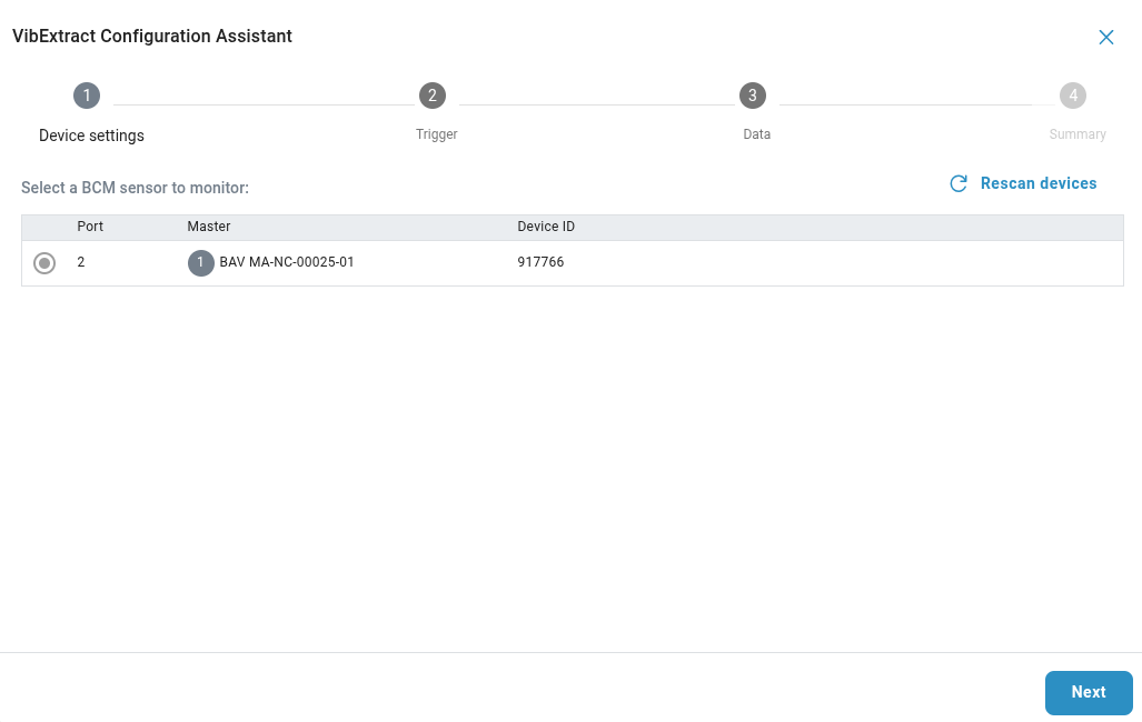 The data of the BCM VibExtract App from one sensor can all be found under the same measurement according to the connected port X: port{X}-bcm.