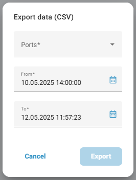A dialog will show up. Here you can select the time span and the sensors, of which you want to export the data. After selecting the sensors and the time span, click on Export.