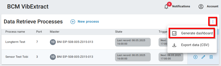 Generating new VibExtract dashboards will overwrite all previous VibExtract dashboards.