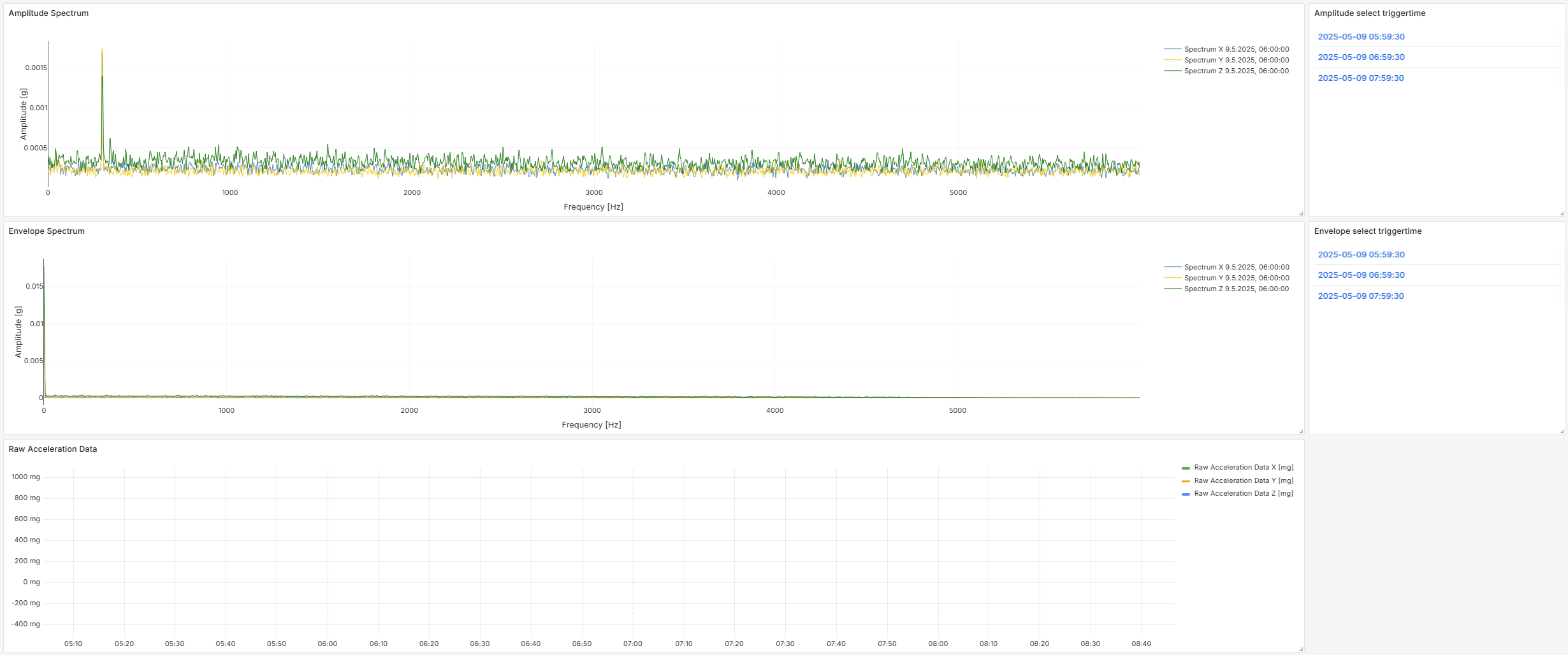 A graph is generated for each type of recorded data. If you record amplitude spectrum, envelope spectrum and raw acceleration data, it will show three graphs. If you only record one type, it will only show the graph of this type. If there is more than one record of a type, all records will be listed on the right and you can select the desired record.