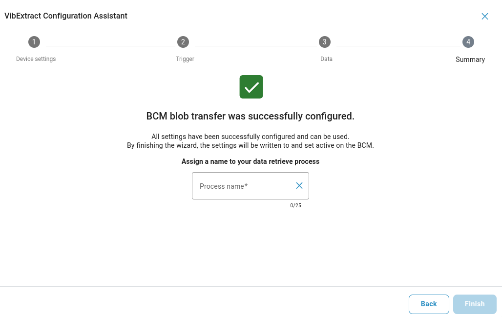 Be aware the the transfer process time will depend on the selected axes. If you select one axes, it will record 15 second of data and the transfer time will take between 6 and 60 minutes (Will take 60 minutes if 8 sensors connected to a BNI are triggered at the same time).