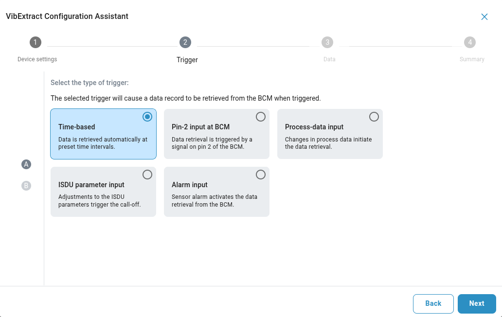 - Alarm input: Sensor alarm activates the the data retrieval from the BCM. It is necessary to set-up the trigger-logic in the IO-Link settings of the BCM.
