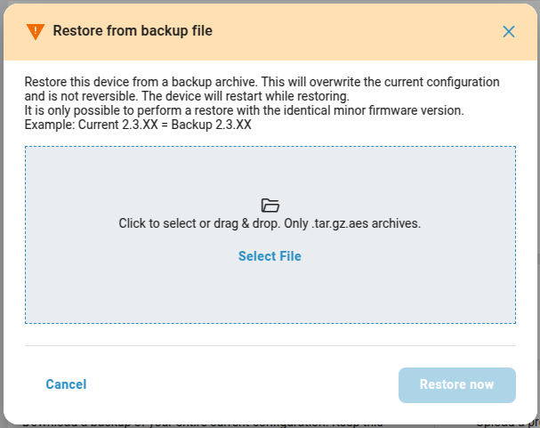 In the settings next to the backup creation, you can also find the backup restoration. Click on Restore from file. Now you can upload the backup file and click on Restore now