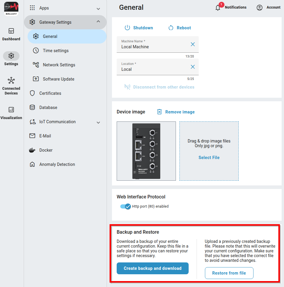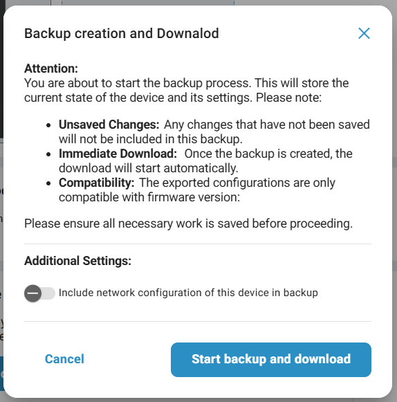 Before downloading, you can decide, if the backup should include the network settings. If you intend to duplicate the settings, this can lead to IP conflicts. It is recommended that you don't back up the network settings if you want to transfer the settings to a new device. If you want to restore the settings to the same device, you can back up the network settings.