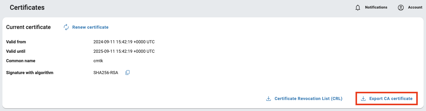 Export the CA certificate by clicking on the Export CA certificate button and select a certificate format depending on the operating system (Windows -> .crt). The Certificate Revocation List is required for OPC UA.