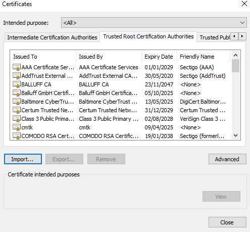 Click on Trusted Root Certification Authorities, after that klick on Import...