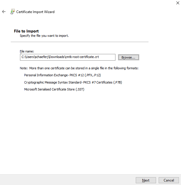 Select the certificate file you downloaded in step one and klick on Next