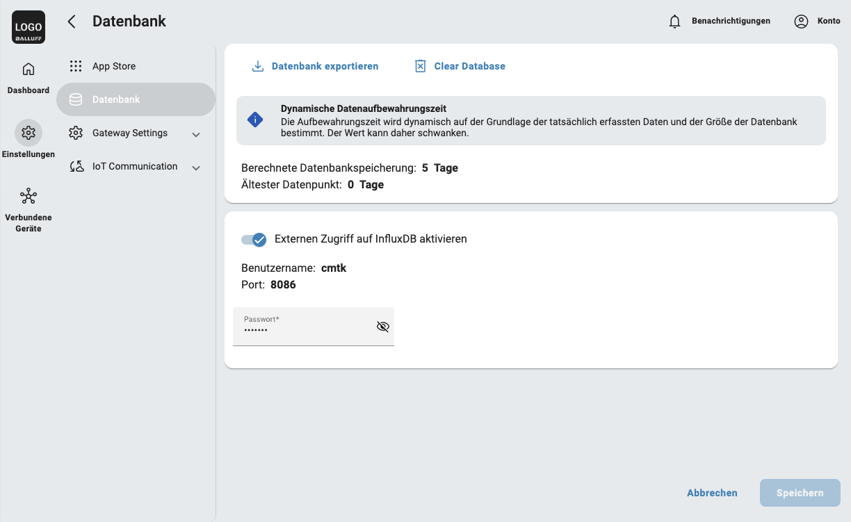 Aktivieren Sie die Funktion Externen InfluxDB-Zugriff aktivieren, um den externen Zugriff auf die Datenbank (influxDB) zu ermöglichen.