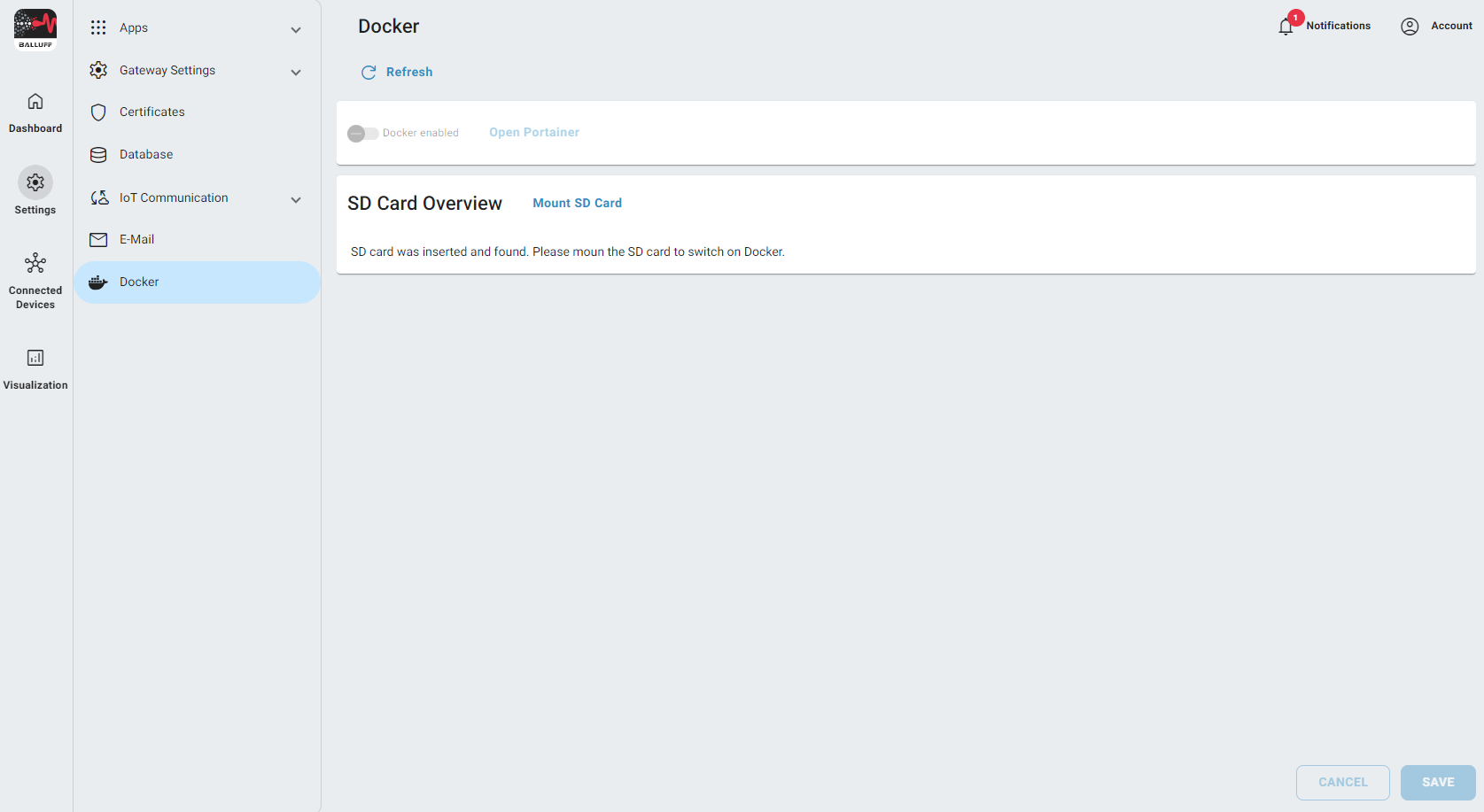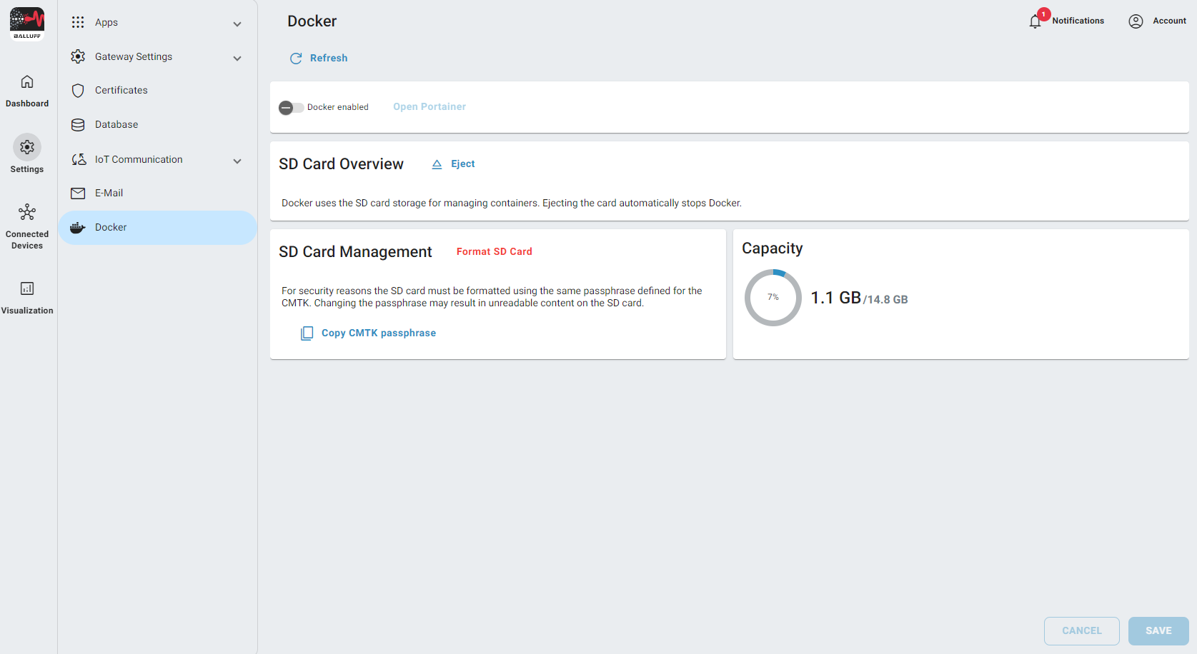 Before we can enable Docker is necessary to mount the SD Card to the CMTK, that means the SD Card is recognized by the CMTK as a valid storage for Docker.