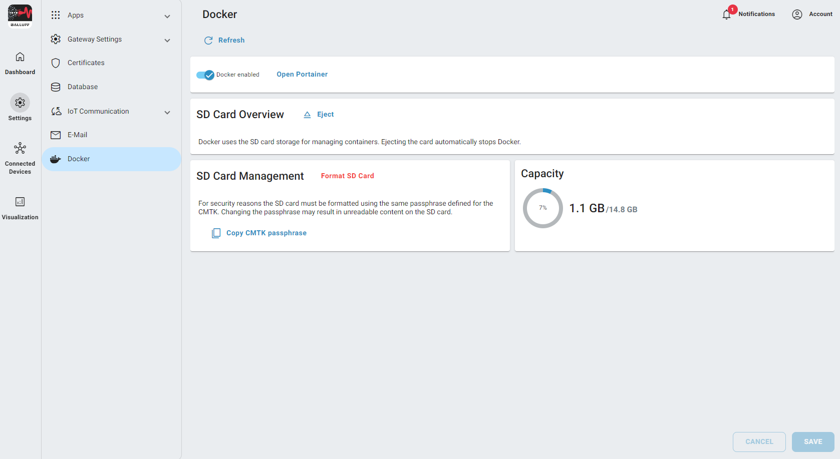 The SD Card will be formatted with the passphrase. All data on the Card will be lost. It can take a few minutes until Portainer starts after the formatting.
