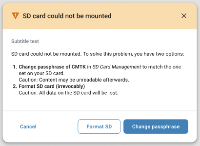 In case this message pops up, you connected an SD Card with an other passphrase then the passphrase of the device. There are two possibilities to solve it.