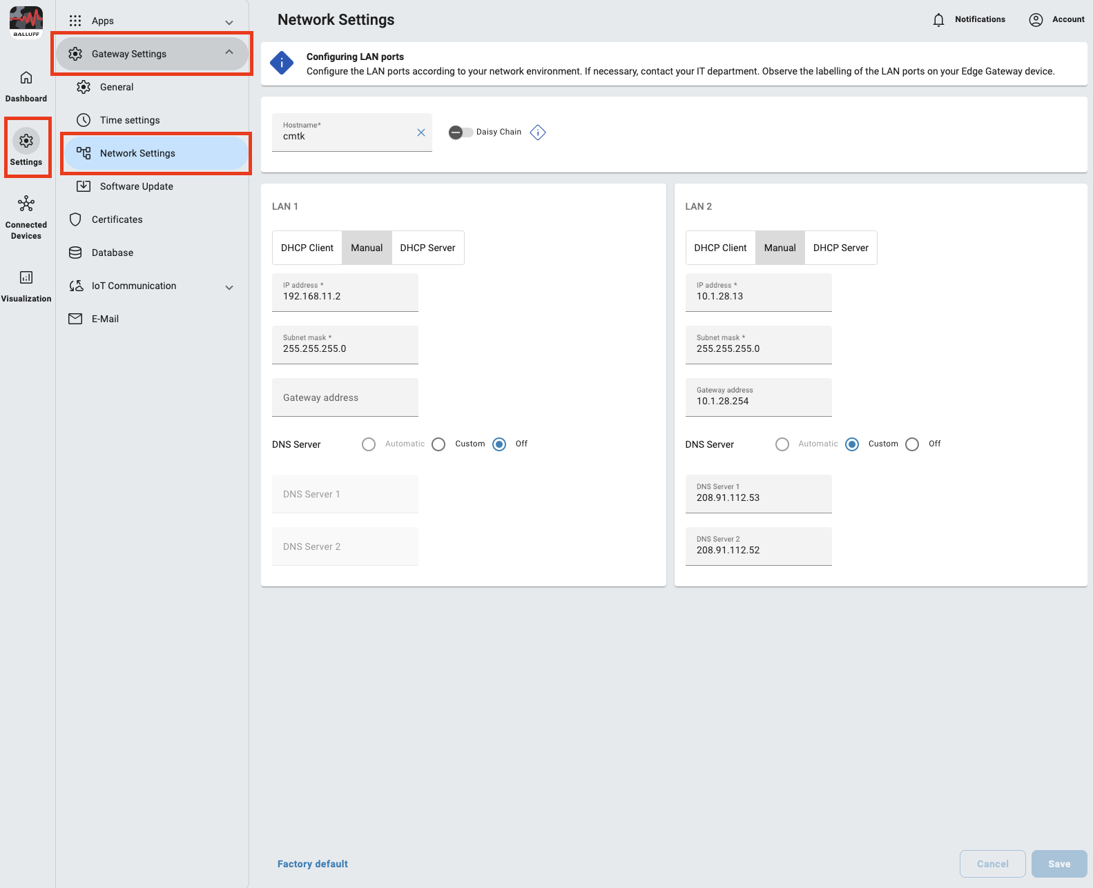 In the network settings you make various settings for the two LAN ports on the CMTK.